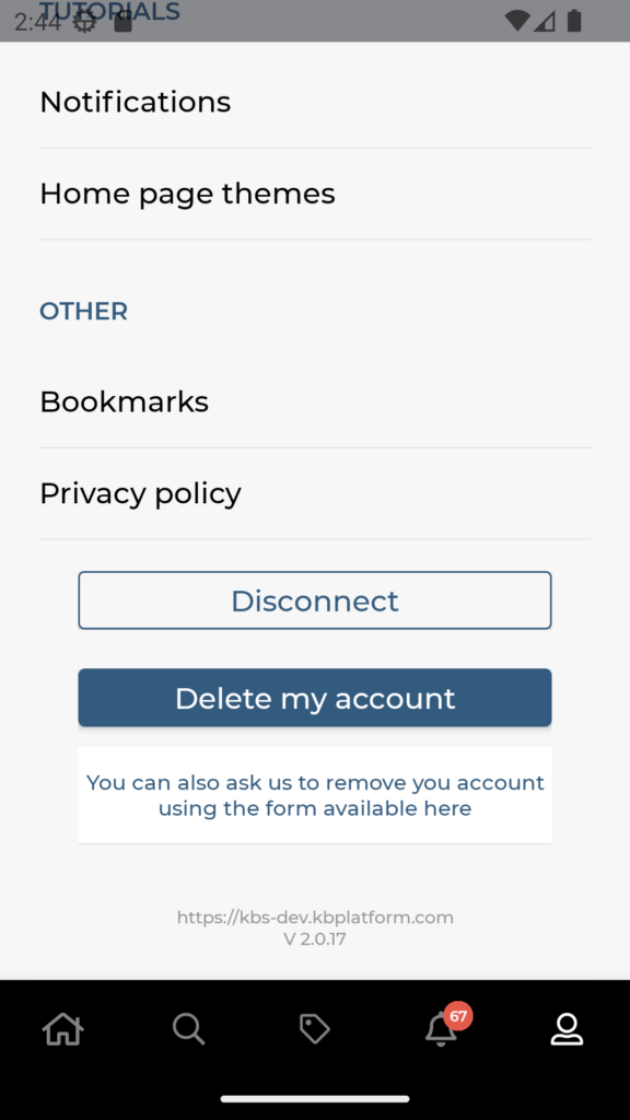 To delete your account open KB Suite mobile application and go to your Personal Account through the main menu. Once in your account scroll to the end of the page and click on the « Delete my account » button. If you confirm that you want to delete your account, all your data will be deleted from the mobile application on your smartphone and on the online platform. No data from your account will be kept and if you want to use again the application you will have to create a new account.