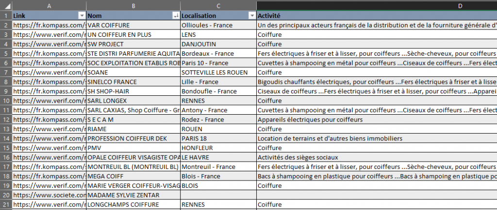 Extrait d’un tableau regroupant les informations issues de plusieurs bases de données. En colonne on retrouve les sources, noms des sociétés, leurs activités et localisations.