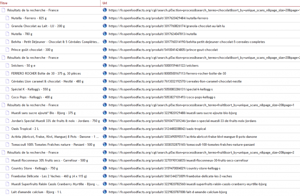 Capture d’écran des résultats d’un crawl sur la base de données Openfoodfacts, en surveillant les termes « chocolat » et « fruit », sur deux pages.
